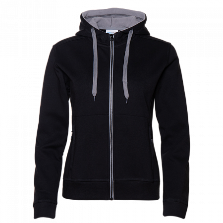Женская толстовка прямого силуэта с капюшоном комфортной глубины, втачным рукавом, прорезным карманов и застежкой на контрастную молнию. Капюшон дополнен плоским шнурком для регулировки прилегания, манжет и низ изделия выполнены из основного полотна.