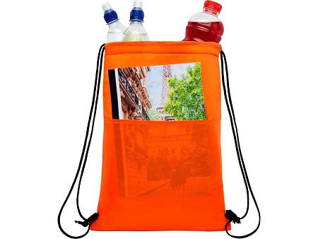Сумка-холодильник затягивается на шнурок черного цвета. С открытым передним карманом. Вмещает 12 банок. Прочность до 5 кг.
