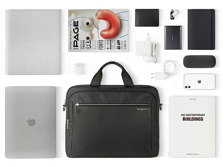 Внешняя организация: переднее отделение на молнии с карманом-органайзером (открытый карман, 3 слота для карточек, 2 держателя для пишущих принадлежностей), передний карман на молнии, задний карман на молнии с ремнём для соединения с телескопической ручкой чемодана, ручки высотой 9 см, съёмный регулируемый плечевой ремень (до 150 см)