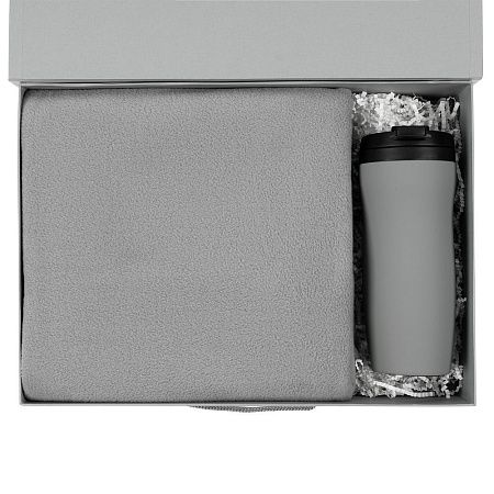 термостакан - пластик, крышка, внутренняя колба; нержавеющая сталь, корпус; покрытие софт-тач; плед - флис, плотность 180 г/м²; коробка - переплетный картон; наполнитель - бумага