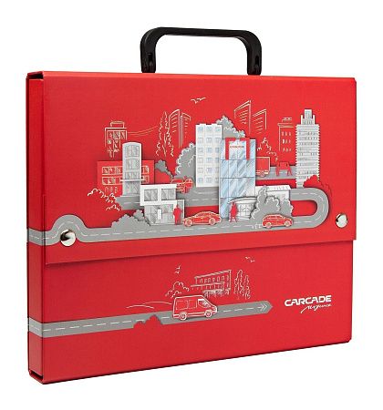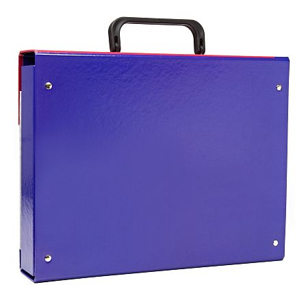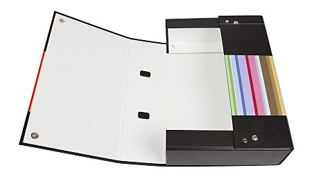 Брендированные портфели с пластиковой ручкой для переноски из кашированного переплётного картона на заказ с кнопками защелками.