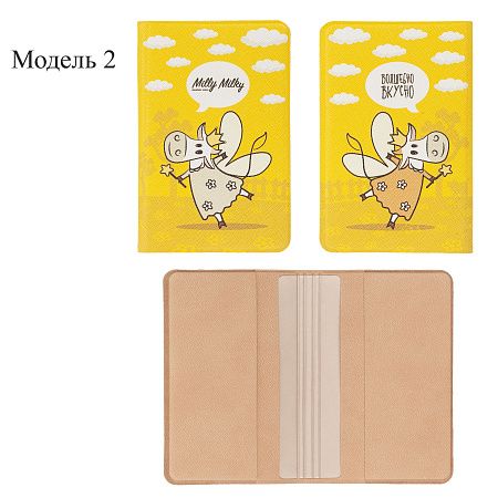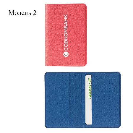 Модель 2: материал искусственная кожа (Saffiano), спайка, размер вкладыша 5,4x8,6 см, внешний размер изделия 6,2(13)x9,5 см, складная, на магните, 4 кармана, блинтовое тиснение / полноцветная печать, аналог