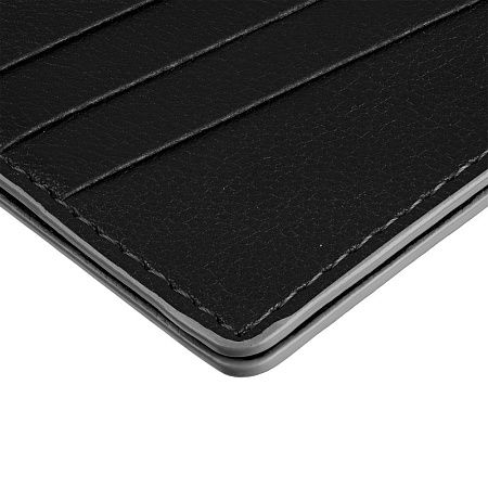 Чехол выполнен из материала Petrus, синий НН, дополнен окрашенным срезом края и внутренним карманом из серого картона. Имеет 4 отделения для кредитных карт и 1 отделение для купюр.
