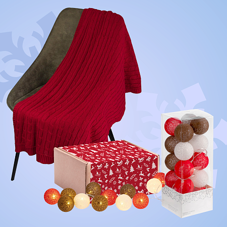 Подарочный набор «Всё переплетено» — идеальный выбор для уютных вечеров. В него входит мягкий плед, который согреет вас холодными зимними вечерами, и гирлянда с тёплым светом, которая создаст уютную атмосферу и праздничное настроение в вашем доме.