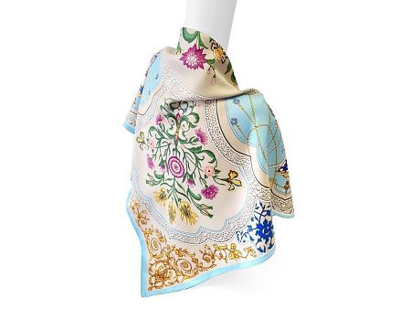 Платок “Сады Востока” от бренда “Русские в моде” by Nina Ruchkina посвящен экзотической красоте, женской привлекательности и очарованию. В центре полотна расположились цветы дивного сада, олицетворяющие собой процветание, мир и земную любовь. Рядом изображены кувшины, наполненные росой молодости и секретами вечно цветущих восточных красавиц.