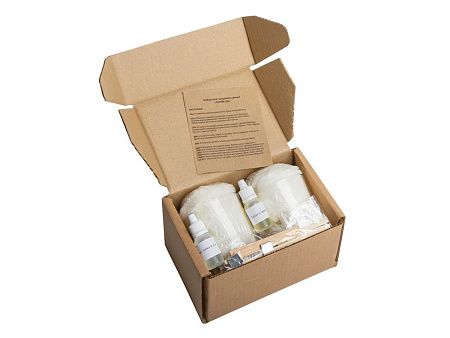 свечная масса, 2 стеклянных стакана, 2 фитиля деревянных, 2 держателя для фитиля, 2 вида отдушки, инструкция