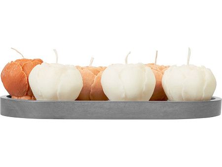 три белых свечи пион, одна темно-персиковая свеча пион, две персиковые свечи пион, подставка гипсобетон, упаковочный материал
