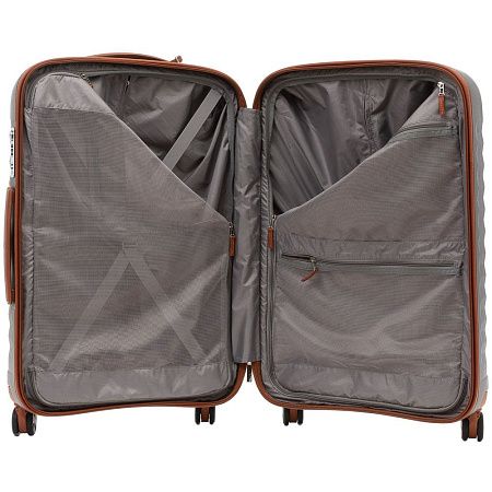 Наружные и внутренние элементы — ручки, фурнитура, обрамление молний и адресная бирка — выполнены из натуральной кожи, благодаря чему чемодан E-Lite приобретает по-настоящему изысканный вид.