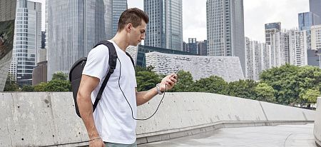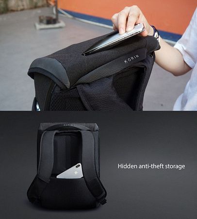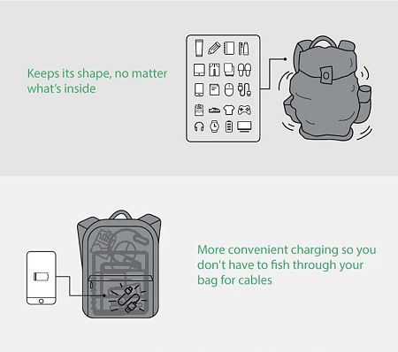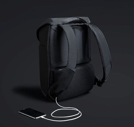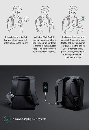 Если необходимо достать какие-то мелочи, достаточно зафиксировать липучки для вертикального открытия на 30°, а для того, чтобы аккуратно уложить в рюкзак много различных предметов, просто положите его и раскройте на 180°. Дополнительно в основном отделении расположены еще 5 карманов различного функционала, в один из которых размером 16х10 см можно поместить powerbank, т к в него приходит USB-кабель, соединенный с портом на внешней стороне рюкзака для легкого подключения к смартфону. Это оригинальная запатентованная система зарядки K EasyCharging 3.0 нового поколения с помощью USB-порта, расположенного в лямке рюкзака, и кабеля, идущего к powerbank, что делает мобильную зарядку более удобной.