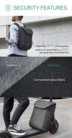 Вместительный городской рюкзак ClickPack X черного цвета, обладатель премии iF Design Award 2020. Сделан из свехпрочного устойчивого к порезам и трению водоотталкивающего полиэстера многослойного плетения. Сочетание полиэстера и стекловолокна защищает от порезов ножом или другими острыми предметами. Конструкция достаточно жесткая, не деформируется. Детально продуманная организация отделений позволяет грамотно распределить вес. Самые тяжелые предметы располагаются ближе к спине.