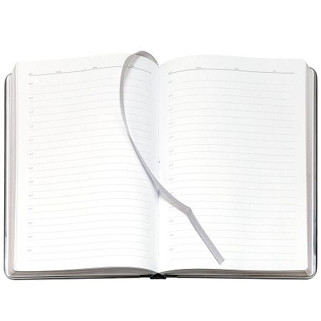 Ежедневник с твердой обложкой и серебристым обрезом, выполнен из материала Saffian, черный, дополнен серым ляссе и металлическими рамками.