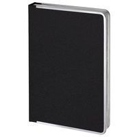 Ежедневник с твердой обложкой и серебристым обрезом, выполнен из материала Saffian, черный, дополнен серым ляссе и металлическими рамками.