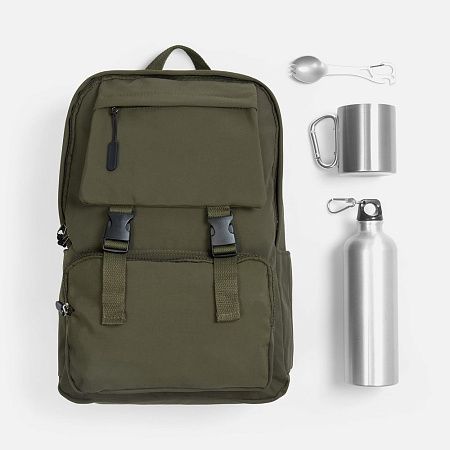 рюкзак - нейлон; кружка - пищевая сталь, 304, внутри - нержавеющая сталь, 201; бутылка - алюминий; столовый прибор - нержавеющая сталь, 420