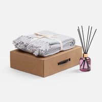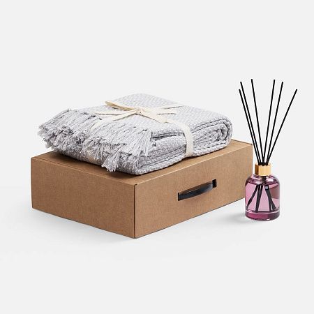 плед - хлопок 80%, полиэстер 20%, плотность 260 г/м²; флакон - стекло, палочки из файбера; коробка - микрогофрокартон