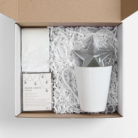 кружка - костяной фарфор; гирлянда - пластик, металл; свеча - парафин; ежедневник - искусственная кожа; ручка - металл
