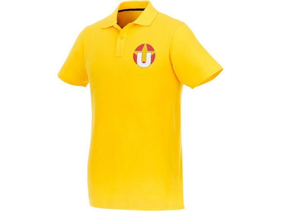 Мужское поло Helios с коротким рукавом. Отрезной-отрывной ярлык для комфорта. Воротник гладкой вязкой в рубчик. Планка с двумя пуговицами. Двойная строчка на воротнике и внизу изделия. Пуговицы в цвет изделия. Полоска на горловине в контрастном цвете. Трикотаж Piqué, 100 % хлопок. 180 г/м².