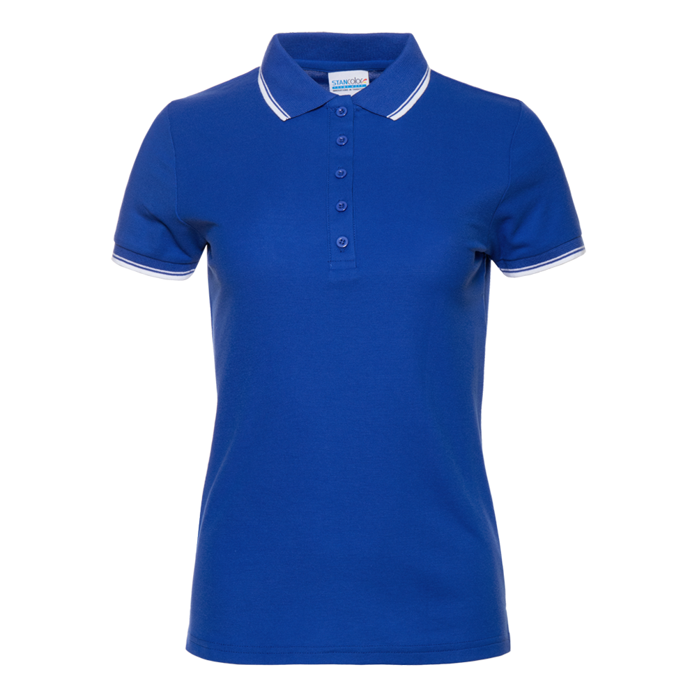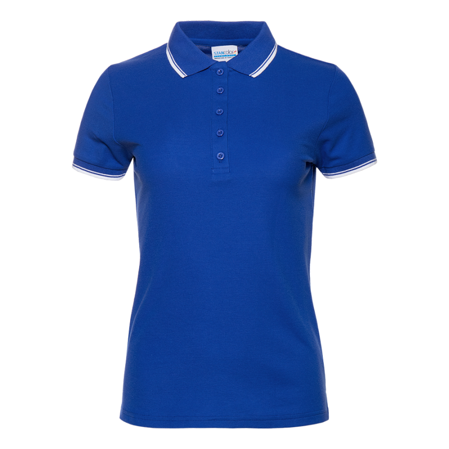 Женское поло приталенного силуэта с отложным воротником, втачным коротким рукавом и застежкой на пуговицы. Воротник и манжет выполнены контрастной резинкой.