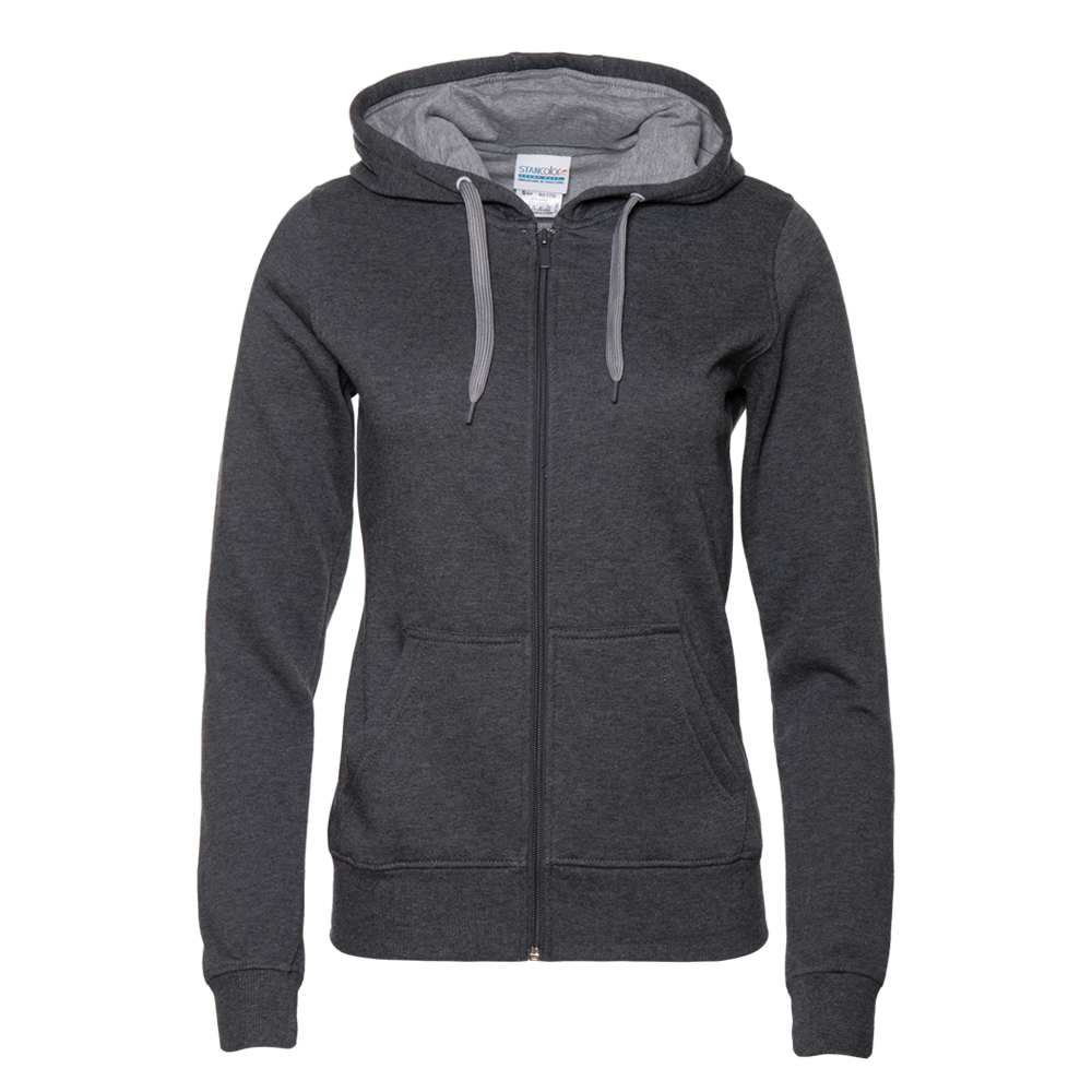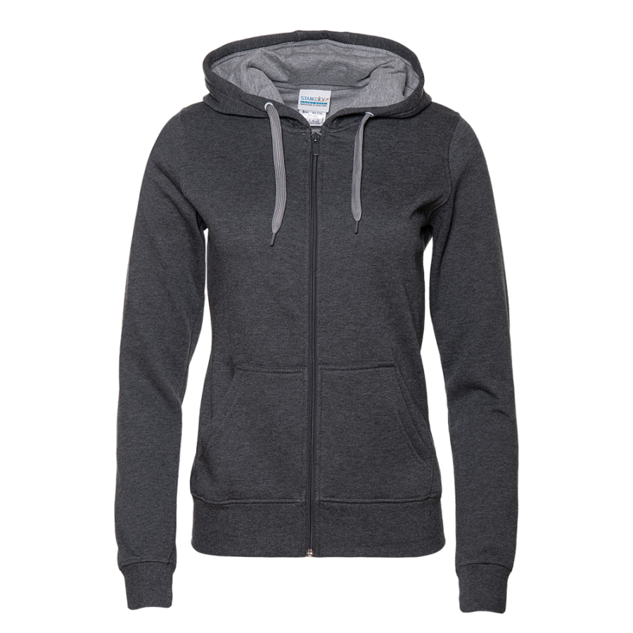Женская толстовка приталенного кроя с капюшоном комфортной глубины, втачным рукавом, накладным карманом и застежкой на молнию в тон основному цвету. Для дополнительной защиты от холода ворот, манжет и низ изделия оформлены эластичной бейкой.
