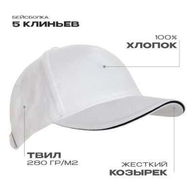 Пятиклиновый пошив без лобового шва, жесткий изогнутый козырек «сэндвич» с контрастным кантом и прочная застежка на металлический замок.
