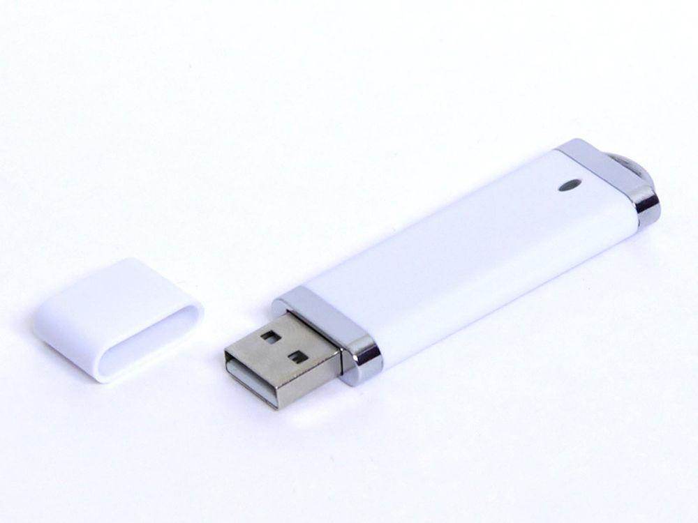 Стандартная флешка в прямоугольном пластиковом корпусе с тонкими алюминиевыми вставками, объем памяти USB3 32 Гб. Пластиковый корпус.
