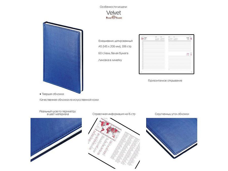 В серии Velvet представлены практичные и стильные модели ежедневников, в которых обложки выполнены из кожзаменителя с рельефом и прострочены по периметру декоративным швом. Закругленные уголки подчеркивают привлекательную и изящную форму ежедневника.