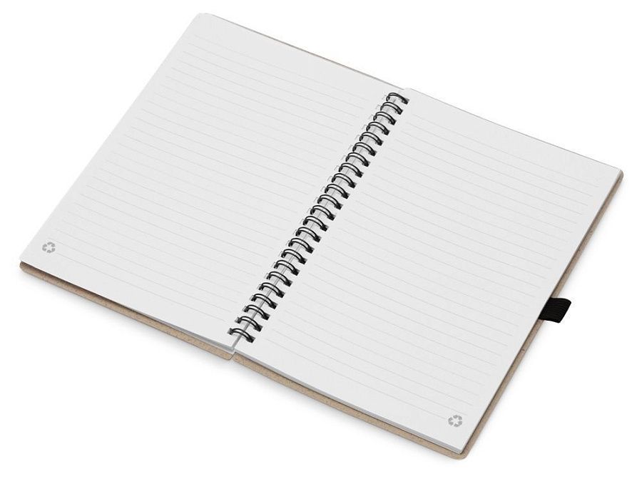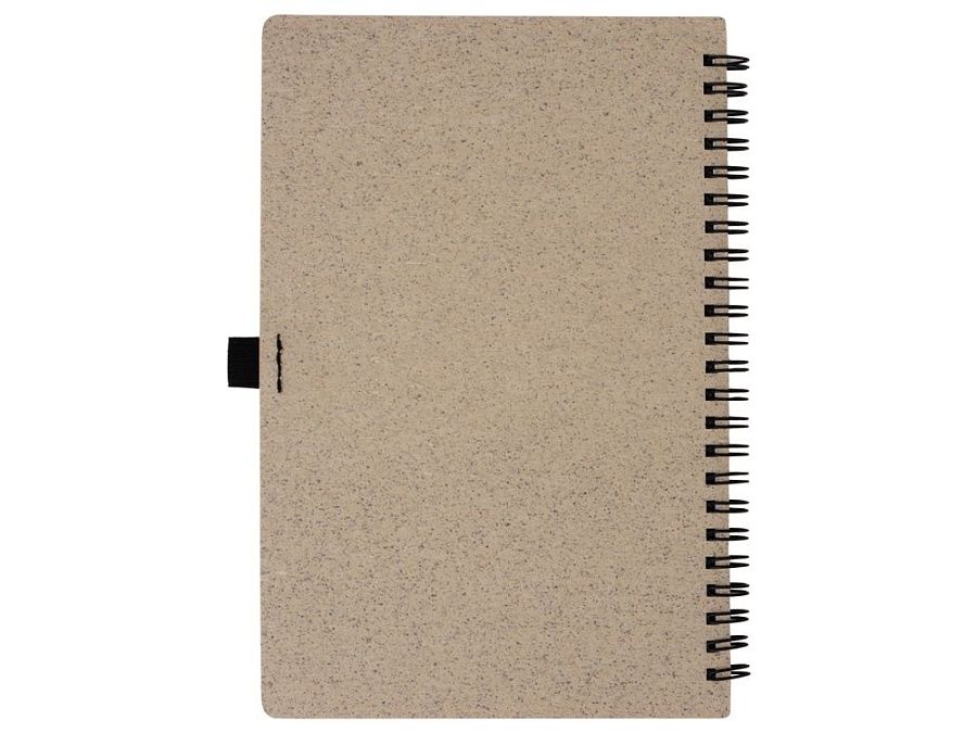 Блокнот с обложкой из переработанной пшеницы и пластика. Блок состоит из 60 листов переработанной бумаги белого цвета. Крепление - пружина. Дополнен петлей для ручки и горизонтальной резинкой.