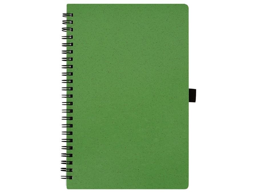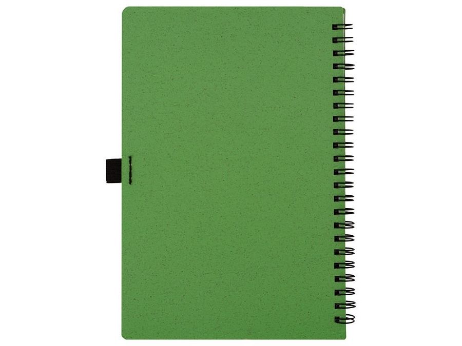 Блокнот с обложкой из переработанной пшеницы и пластика. Блок состоит из 60 листов переработанной бумаги белого цвета. Крепление - пружина. Дополнен петлей для ручки и горизонтальной резинкой.