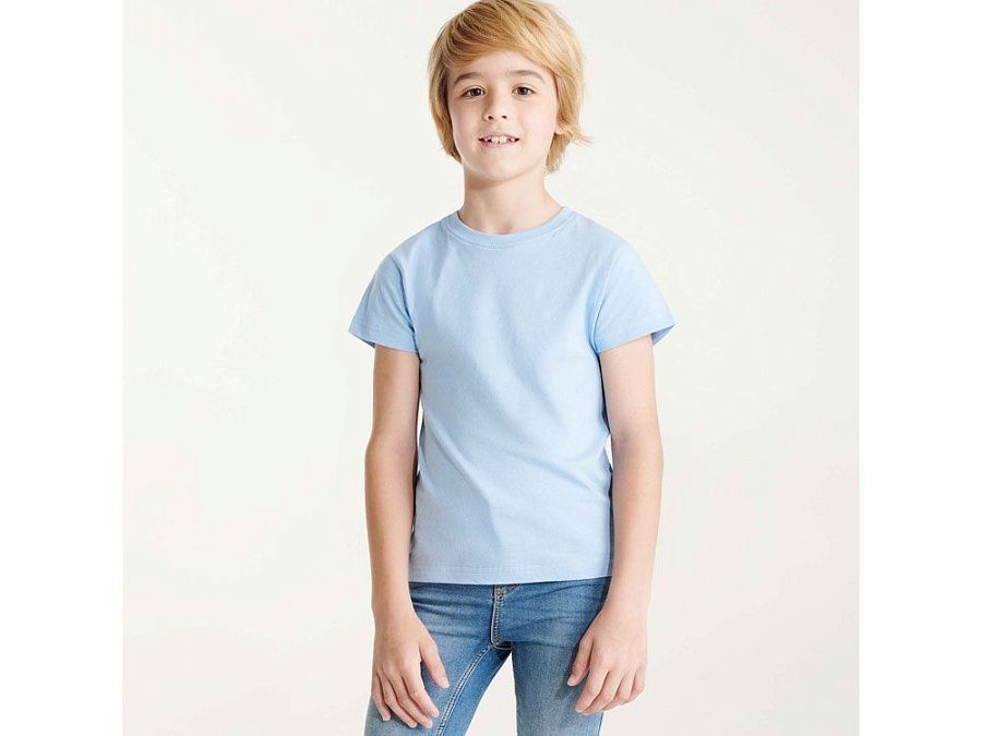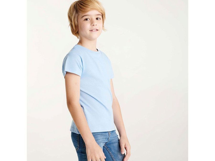 Детская футболка с коротким рукавом с отделкой по горловине двойным рибом с эластаном. Футболка с боковыми швами. Широкая палитра цветов.