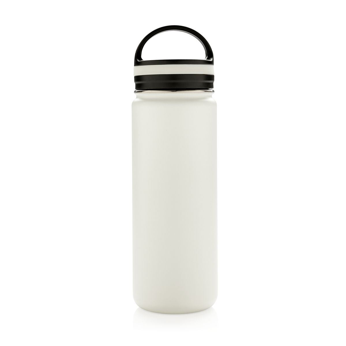Герметичная вакуумная бутылка с двойными стенками и удобной ручкой черного цвета, изготовленная из нержавеющей стали с порошковым покрытием. Широкое горлышко для легкого наполнения и очистки. Идеально подходит для длительных прогулок, пляжного отдыха или даже офиса. Внутренний слой из стали марки 304 и внешний марки 201 сохраняет ваши напитки горячими до 5 часов и холодными до 15 часов. Объем: 500 мл.