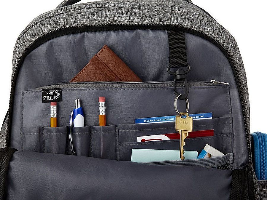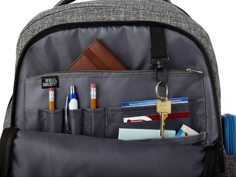 Рюкзак Vault для ноутбука 15.6" с защитой RFID. Изящный, современный рюкзак для ноутбука 15,6 " с большим передним карманом на молнии с карабином для ключей, и скрытым карманом с защитой RFID, чтобы защитить ваши карточки и паспорт от кражи личных данных. Большое основное отделение вмещает ноутбук 15,6" и специальный карман для IPad или планшета. Плотная спинка. Передняя вертикальная молния разработана, чтобы дать вам быстрый доступ к переднему карману. 2 дополнительных боковых кармана для большего места, регулируемые, мягкие ремни рюкзака позволят прикрепить к ним дополнительные аксессуары. Ручка вверху и стропа для крепления к чемодану. 600D полиэстер с акцентами из ПУ винила.