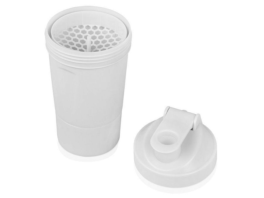 Шейкер для спортивного питания - это один из необходимых аксессуаров для спортсменов и людей, ведущих активный образ жизни. В нем можно приготовить протеиновый коктейль или фруктовый напиток. Шейкер классической формы, он удобно лежит в руке, к донышку прикручивается емкость для смешивания (таблетница), в которой можно хранить спортивные добавки: протеиновый порошок, витамины и другие концентраты. Внутри колбы имеется пластиковая сетка, чтобы процеживать спортивный напиток, а также металлический размешиватель, который растворяет порошок в напитке без комочков. Объем - 400мл. Шейкер изготовлен из пищевого пластика, он герметичен и легко моется.