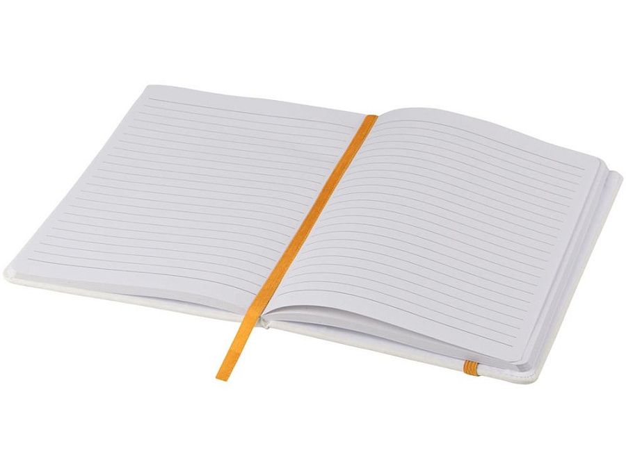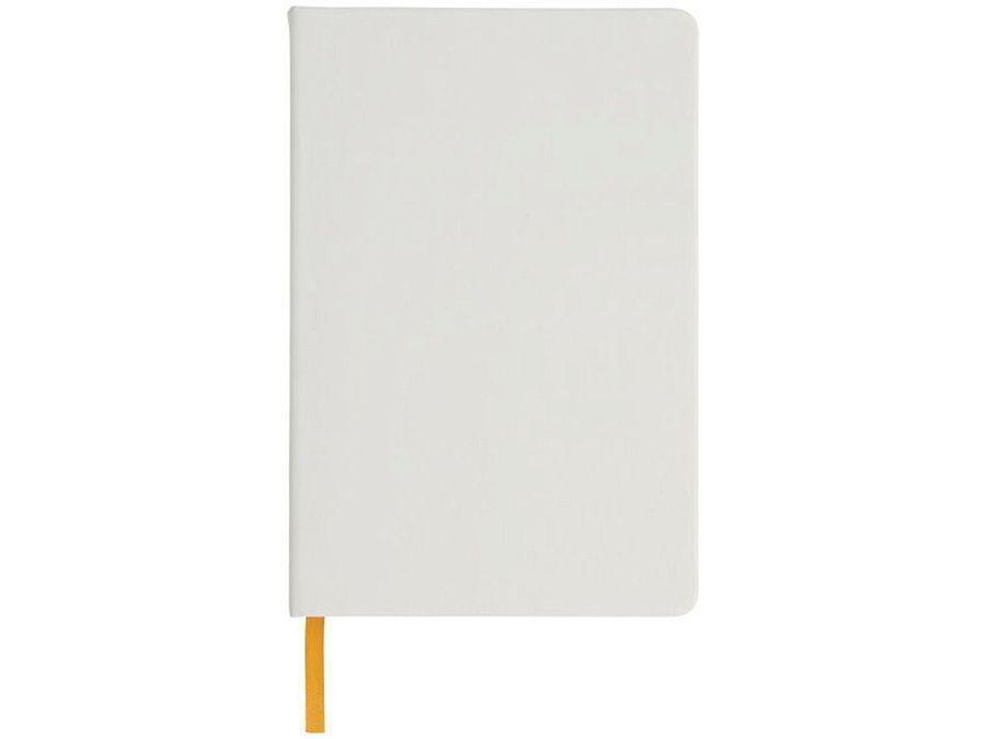 Белый блокнот A5 с цветной эластичной закладкой и резинкой. 96 страниц (60g/m2), линованная бумага. На обложке возможна цифровая печать.