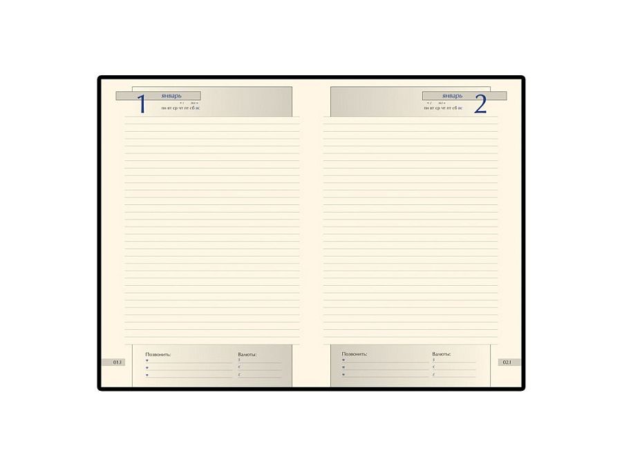 В ежедневнике есть полезная справочная информация и телефонная книга, а также 416 страниц для записи идей, мыслей и составления рабочих планов. Для изготовления страниц используется качественный бежевый офсет повышенной плотности (70 г/кв м), которая производится японской фирмой "Daiwa" и подходит для всех видов чернил.