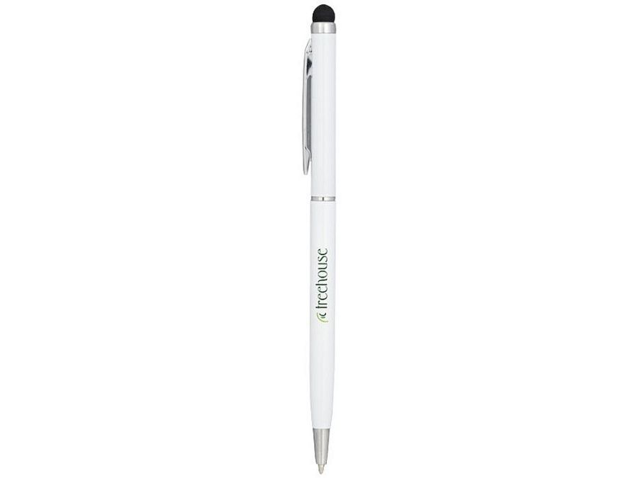 Алюминиевая шариковая ручка Joyce. Тонкая алюминиевая шариковая ручка с поворотным механизмом и стилусом. Алюминиевый корпус с металлическим зажимом и кольцом посередине, остальные элементы из пластика.