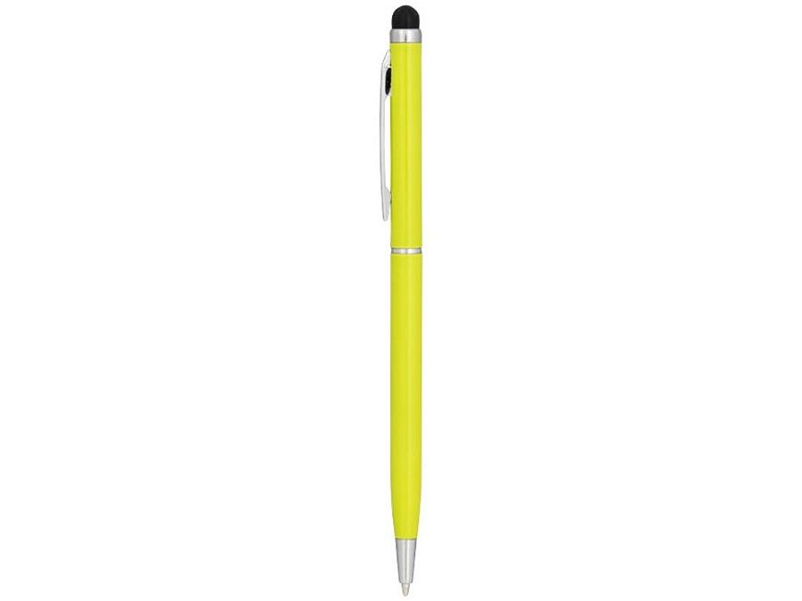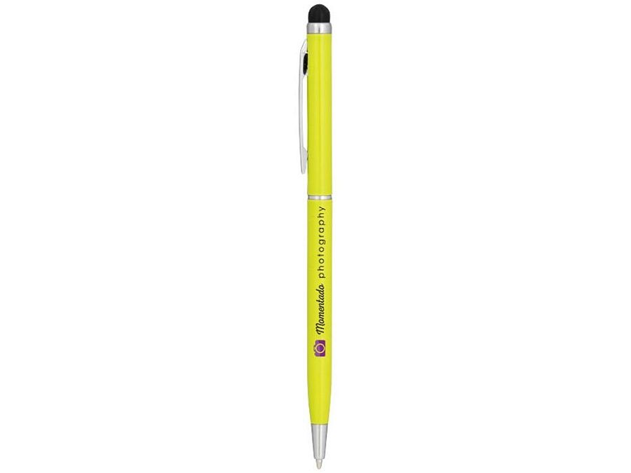 Алюминиевая шариковая ручка Joyce. Тонкая алюминиевая шариковая ручка с поворотным механизмом и стилусом. Алюминиевый корпус с металлическим зажимом и кольцом посередине, остальные элементы из пластика.