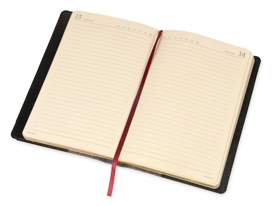 Ежедневник формата А5 выпускается размером 143*216 мм. Полудатированный сменный блок включает 416 страниц бежевого цвета.