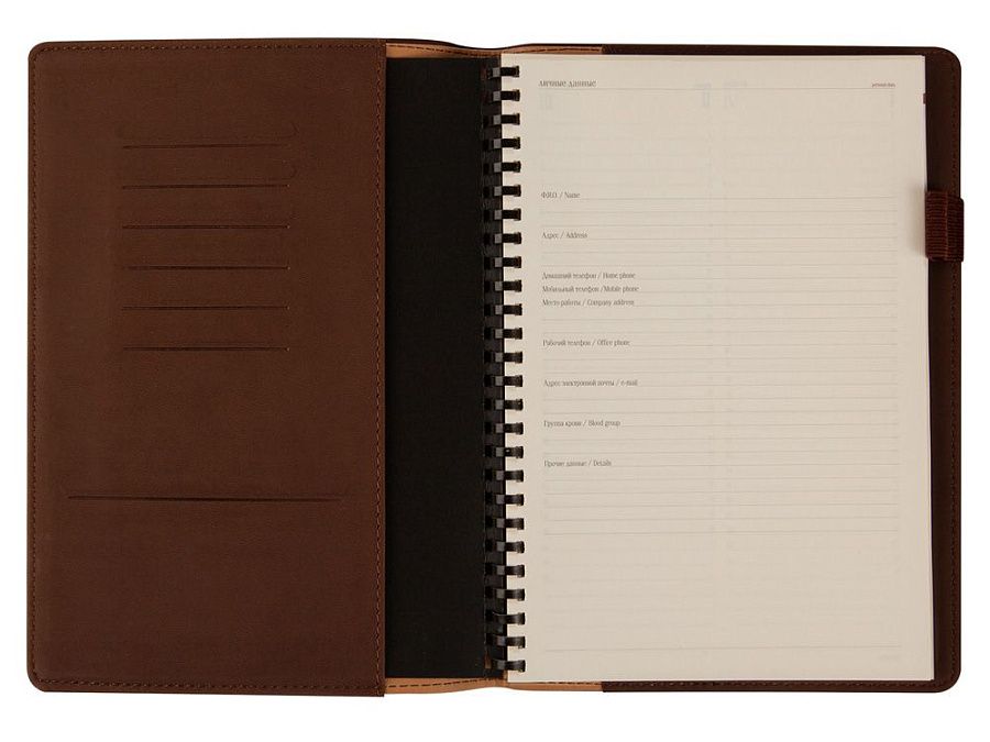 Блок является сменным и вставляется внутрь обложки. С внутренней стороны обложка имеет вырубные отделения для визиток и кредитных карт, а также петлю для ручки на резинке. Для хранения чеков, записок и бумаг внутри расположен прозрачный пластиковый конверт.