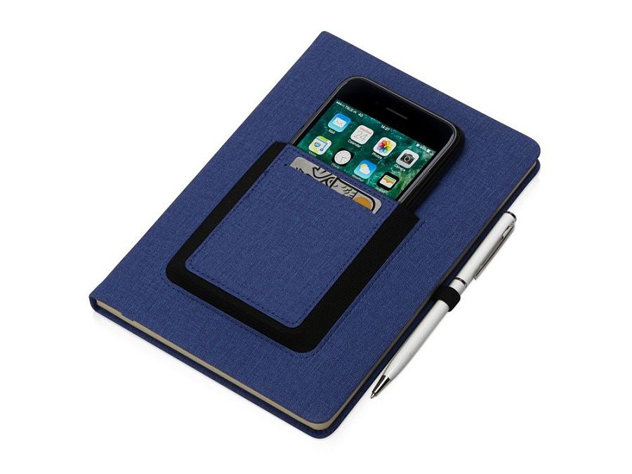 Стильный современный блокнот формата А5. На передней обложке расположен удобный карман для мобильного телефона, бумаг и визиток. Специальная подкладка обложки делает блокнот мягким на ощупь. Покрытие обложки имитирует текстуру текстиля, не скользит и отлично подходит для нанесения логотипа.