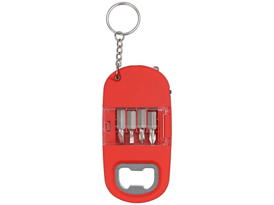 Брелок включает в себя 2 плоские и 2 крестообразные насадки, прочную металлическую открывалку и небольшой фонарик. Корпус сделан из плотного пластика с мягким покрытием soft-touch. Встроенный фонарик позволяет подсвечивать рабочую зону.