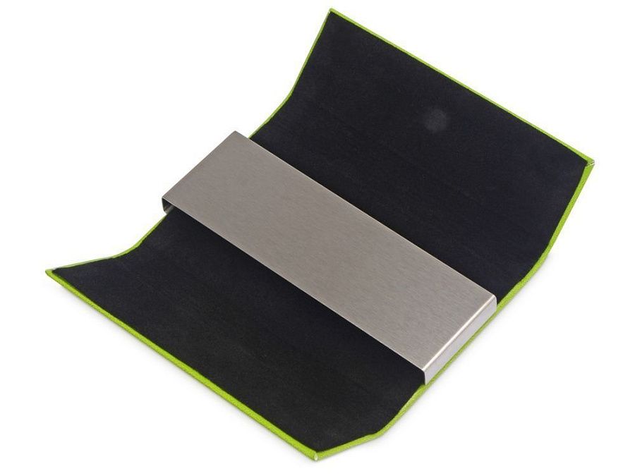 Компактная и легкая визитница выполнена в сочных цветах. Логотип можно нанести на металлическом шильде или на поверхности из искусственной кожи. Вмещает примерно 20 визиток.