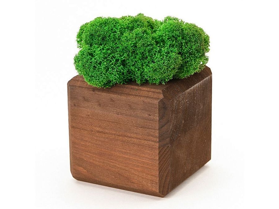 Изделие состоит из стабилизированного мха ягеля, деревянного куба и деревянного упаковочного каркаса. Отталкивает пыль и придает интерьеру индивидуальность. Размер изделия 8х8х13 см.