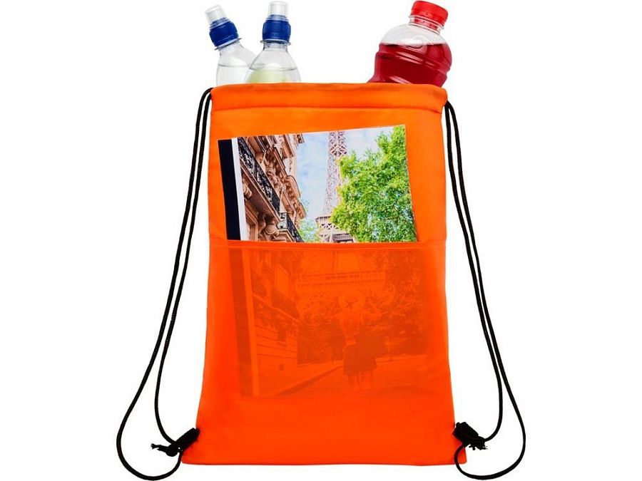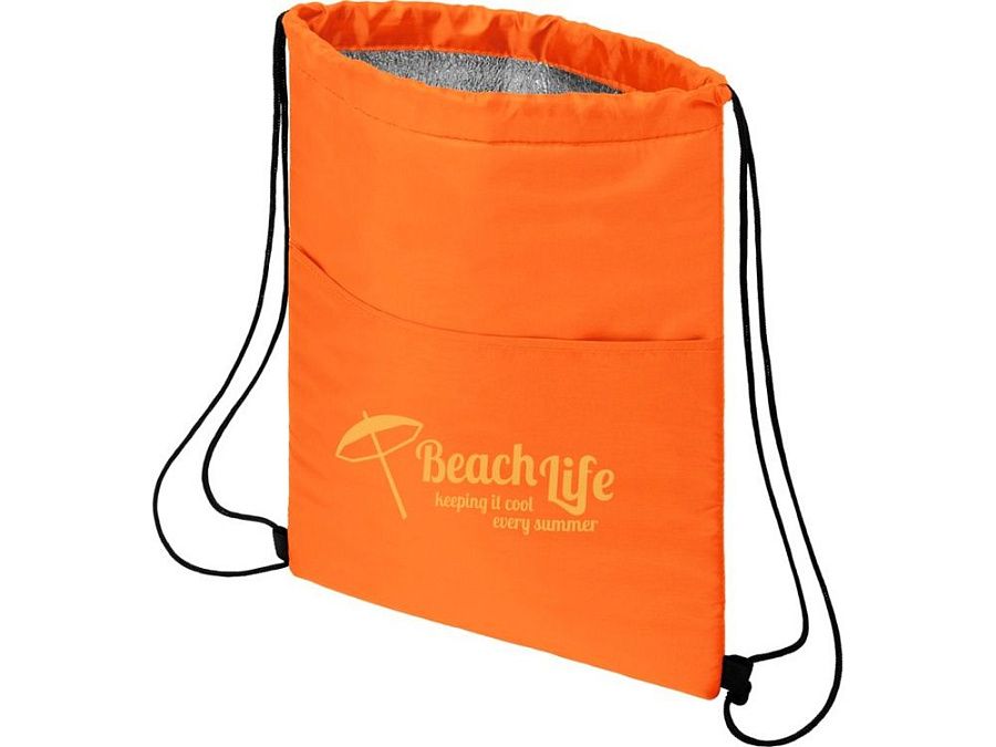 Сумка-холодильник затягивается на шнурок черного цвета. С открытым передним карманом. Вмещает 12 банок. Прочность до 5 кг.