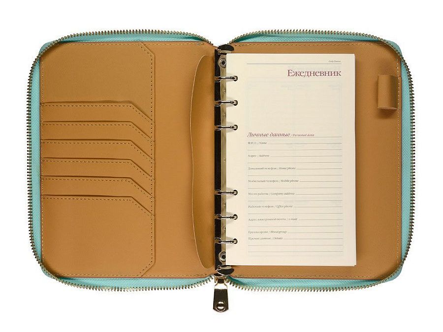 Деловая нежность! Вот как можно охарактеризовать этот очаровательный зефирно-голубой ежедневник. Большое отделение на молнии вмещает в себя и сменный блок для записей на кольцевом механизме, и отделения для визиток и ручки. В этом бизнес-аксессуаре поместятся и дополнительные документы и смартфон.