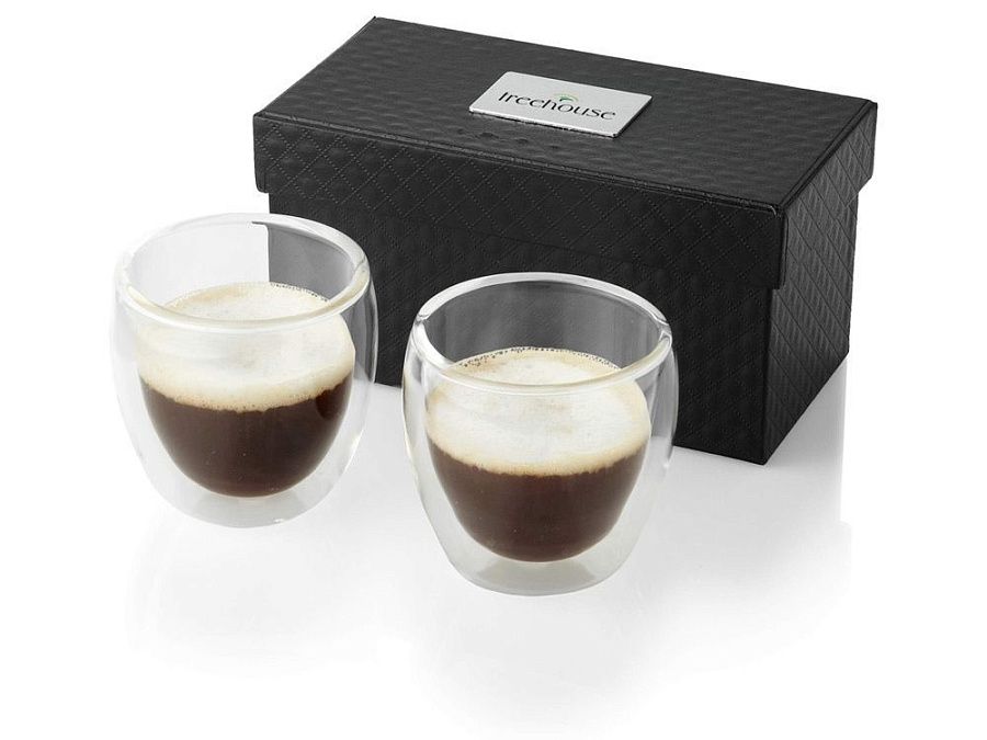 Набор Boda для эспрессо из 2 предметов. Стаканы для эспрессо с двойными стенками емкостью 80 мл. Набор предлагается в роскошной подарочной коробке. Шильд для нанесения логотипа включен в комплект. Стекло.