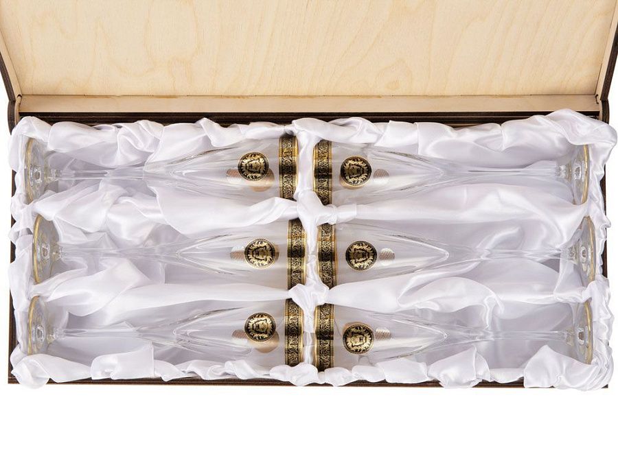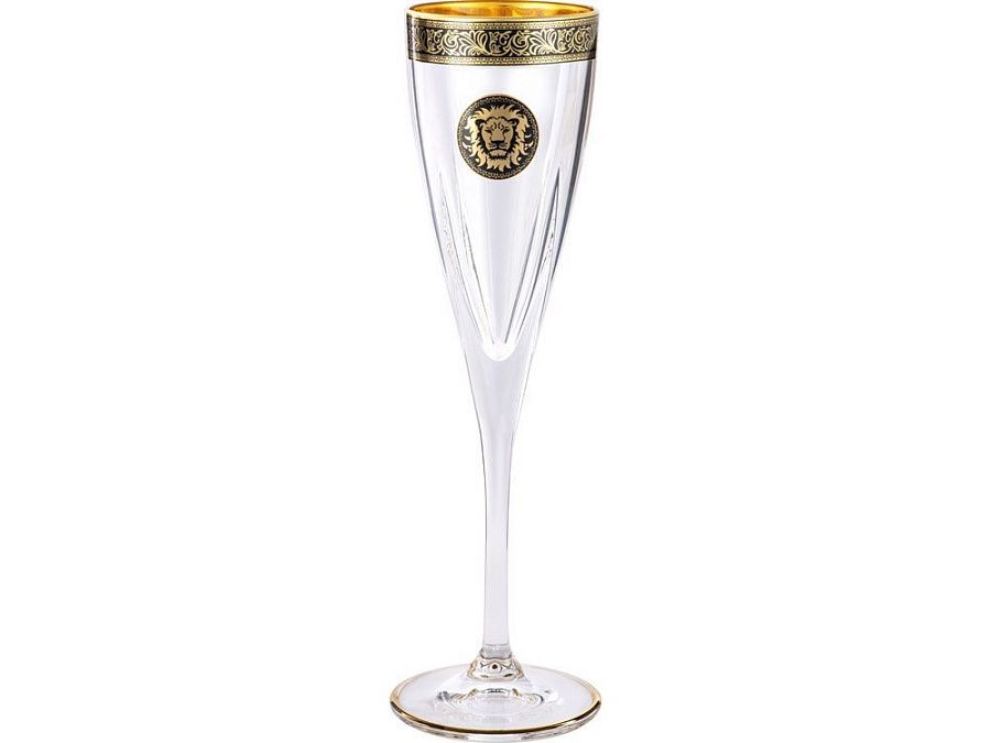 Оригинальный набор бокалов для шампанского, задекорированных золотистым изображением царя зверей – могучего льва. Бокалы выполнены из прозрачного хрусталя с золотистой отделкой по краю и на ножке. Набор рассчитан на 6 персон. Упакован в деревянную коробку.