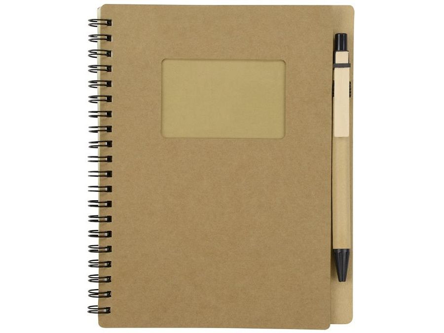 Блокнот «Дейзи» сделан из бумаги и картона и переплетен на пружине. В обложке блокнота предусмотрено окошко 8,3 х 4,7 см, в которое можно поместить визитную карточку или полиграфическую вставку размером 9 х 5,8 см.