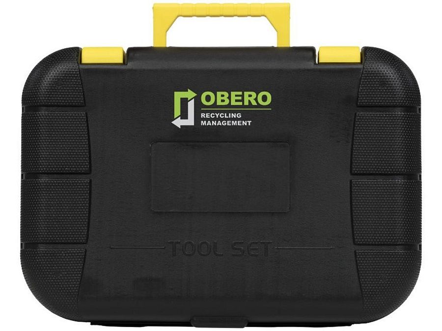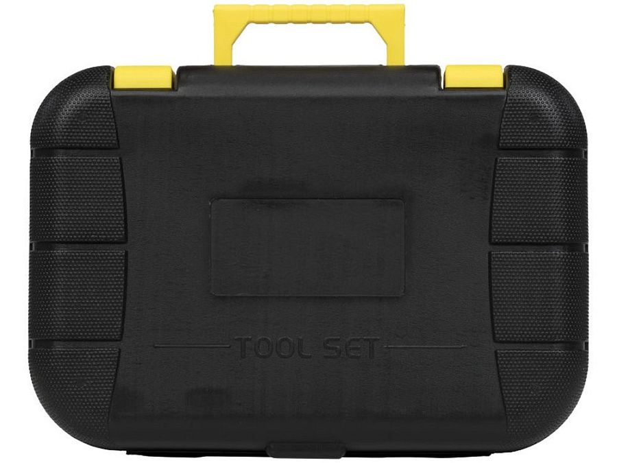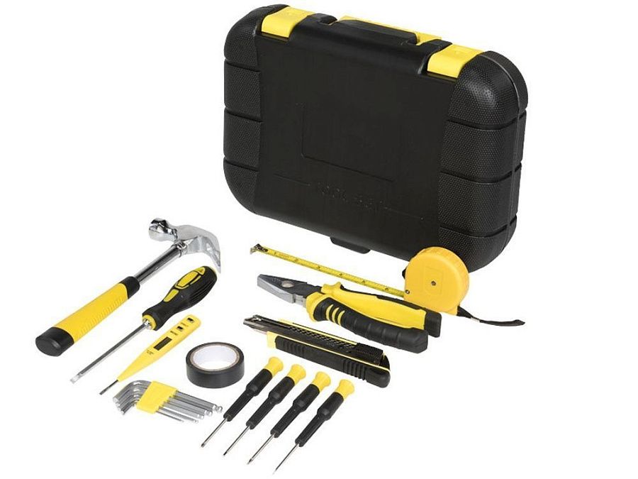 Инструментальный ящик с замком и складной ручкой, включающий молоток-гвоздодер, отвертку с плоским шлицем 4 мм, универсальные плоскогубцы, универсальный нож с фиксатором, 5 шестигранных ключей (2-6 мм) с держателем со стандартными и шаровыми наконечниками, измерительную рулетку длиной 3 м с фиксатором, индикаторную отвертку, изоляционную ленту и 4 прецизионных отвертки. Пластик ABS.
