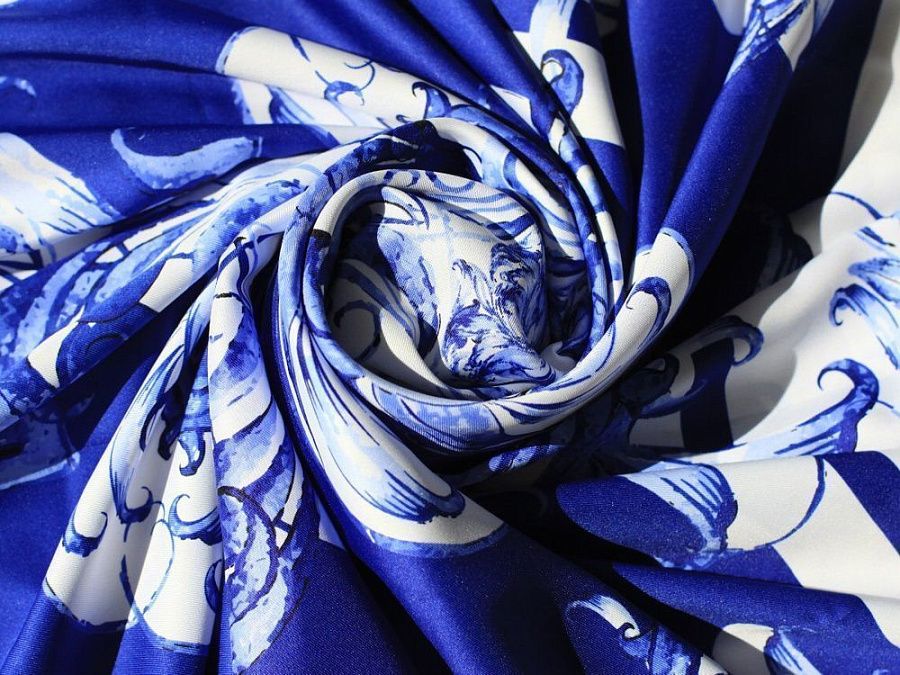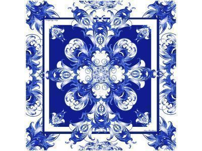 Платок «Гжель» выполнен по мотивам всемирно знаменитой техники русской росписи, названной по месту происхождения – старинного гончарного района Подмосковья.