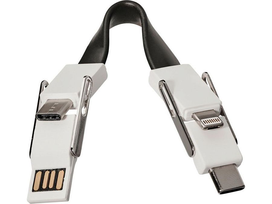 Кабель "4 в 1" позволяет заряжать любые устройства. Он оснащен разъемами USB Type A, Type-C и наконечником "2 в 1", совместимым как с устройствами iOS, так и с устройствами Android. Может использоваться как для зарядки, так и для передачи данных.