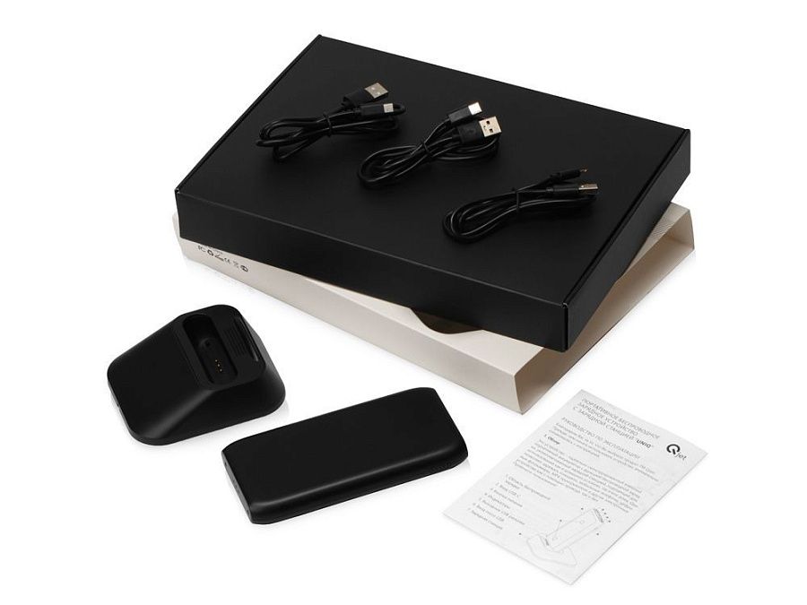 Универсальный беспроводной внешний аккумулятор с зарядной станцией. Главное преимущество – удобство использования. Подключите зарядную станцию к порту USB и установите повербанк стороной со значком беспроводной зарядки к себе (значок находится около USB разъемов). В таком положении повербанк заряжается сам, а также может заряжать и смартфон. Техническая особенность гаджета заключается в наличии сразу 2 индукционных катушек (модулей беспроводной зарядки). Смартфон можно заряжать беспроводным способом в любом положении - как горизонтально, так и вертикально! Если Вы хотите взять повербанк с собой, просто достаньте его из станции одним движением. Повербанк может заряжать одновременно 3 устройства (2 USB разъема + беспроводная зарядка). Чтобы зарядить повербанк традиционным способом без станции - в комплекте имеются кабели USB-C и micro USB. Обе стороны повербанка подходят для печати больших нанесений. Также нанесение логотипа возможно на зарядной станции.